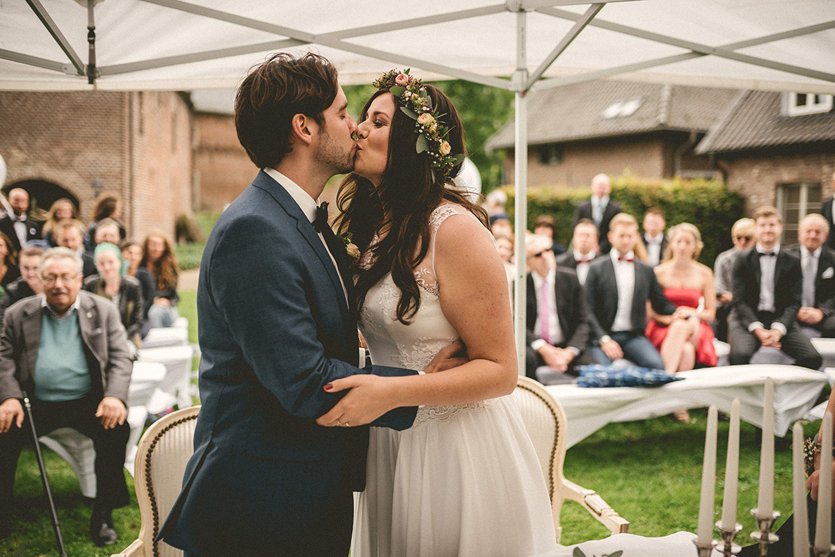 Vor gut einem Jahr heirateten Julia&Christian auf Schloss Wissen in der Nähe von Weeze und ich durfte als Hochzeitsfotograf an ihrem Fest teilhaben. Ich erinnere mich noch daran, wie ich früh am Morgen im Auto auf der Autobahn saß und mich auf die kommenden Stunden extrem gefreut habe. Julia&Christian habe ich bereits beim Vorabshooting in mein Herz geschlossen, daher konnte der Tag nur ein tolles Erlebnis werden. Eine unbekannte Location, wunderbares Wetter mit leichten Regenschauern während der Trauung (auch die möchte ich im Nachhinein nicht mehr missen), eine wahnsinnig tolle Gesellschaft und eine Feier auf dem elterlichen Hof des Bräutigams mit Zugang zum Baggersee, keine 100 Meter vom Hof entfernt – kann man so machen :-)